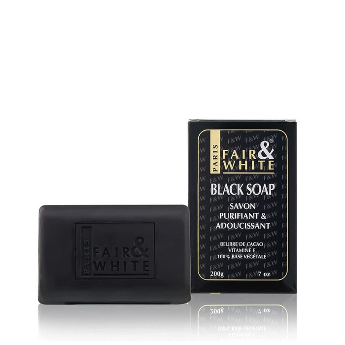Fair and White Black Soap Purifying and Softening Soap Designed to remove surface impurities without stripping skin of moisture. Black Soap cleanses deep within pores, preventing further bacteria build-up with Benzyl Salicylate.